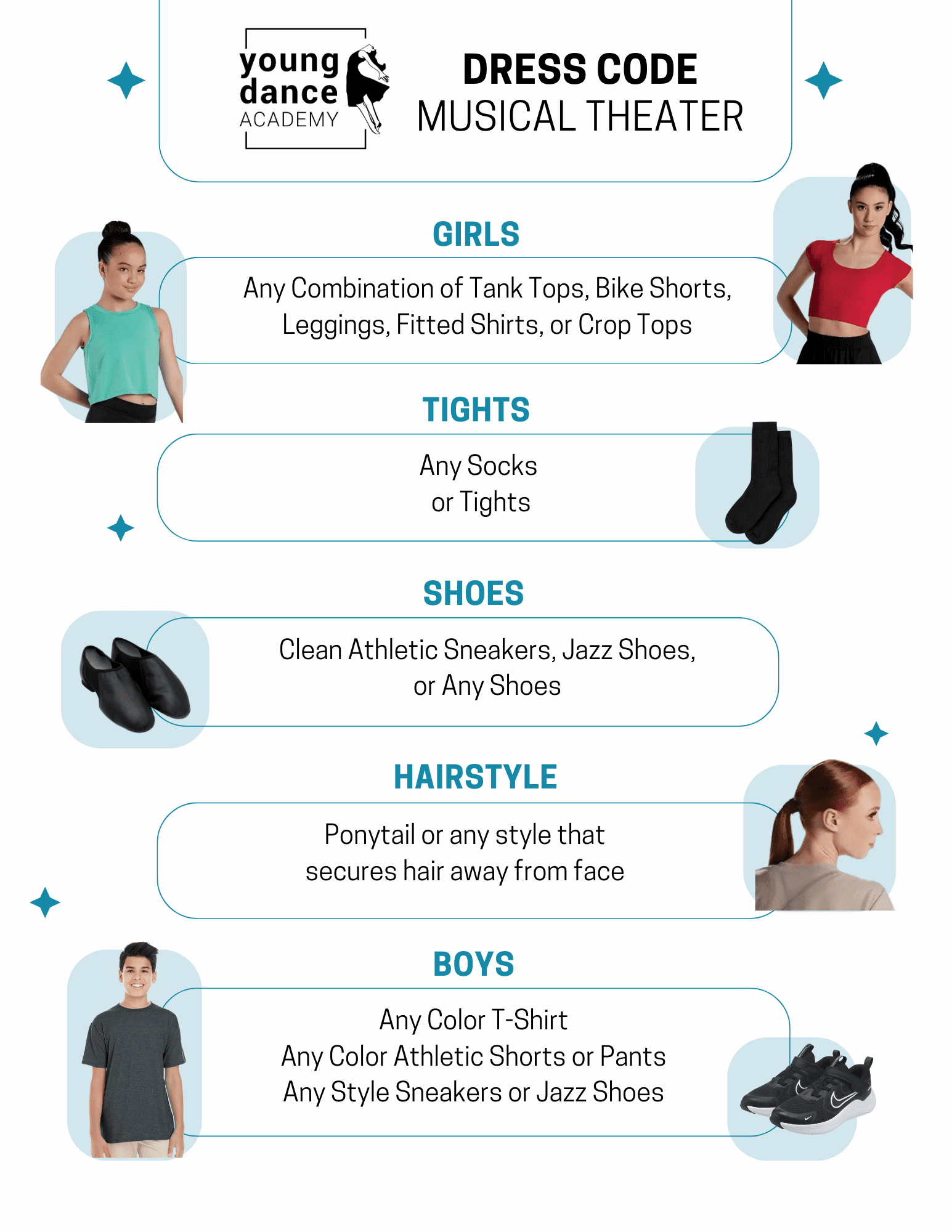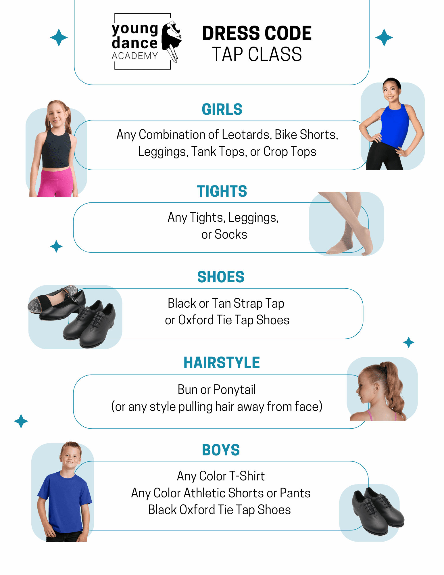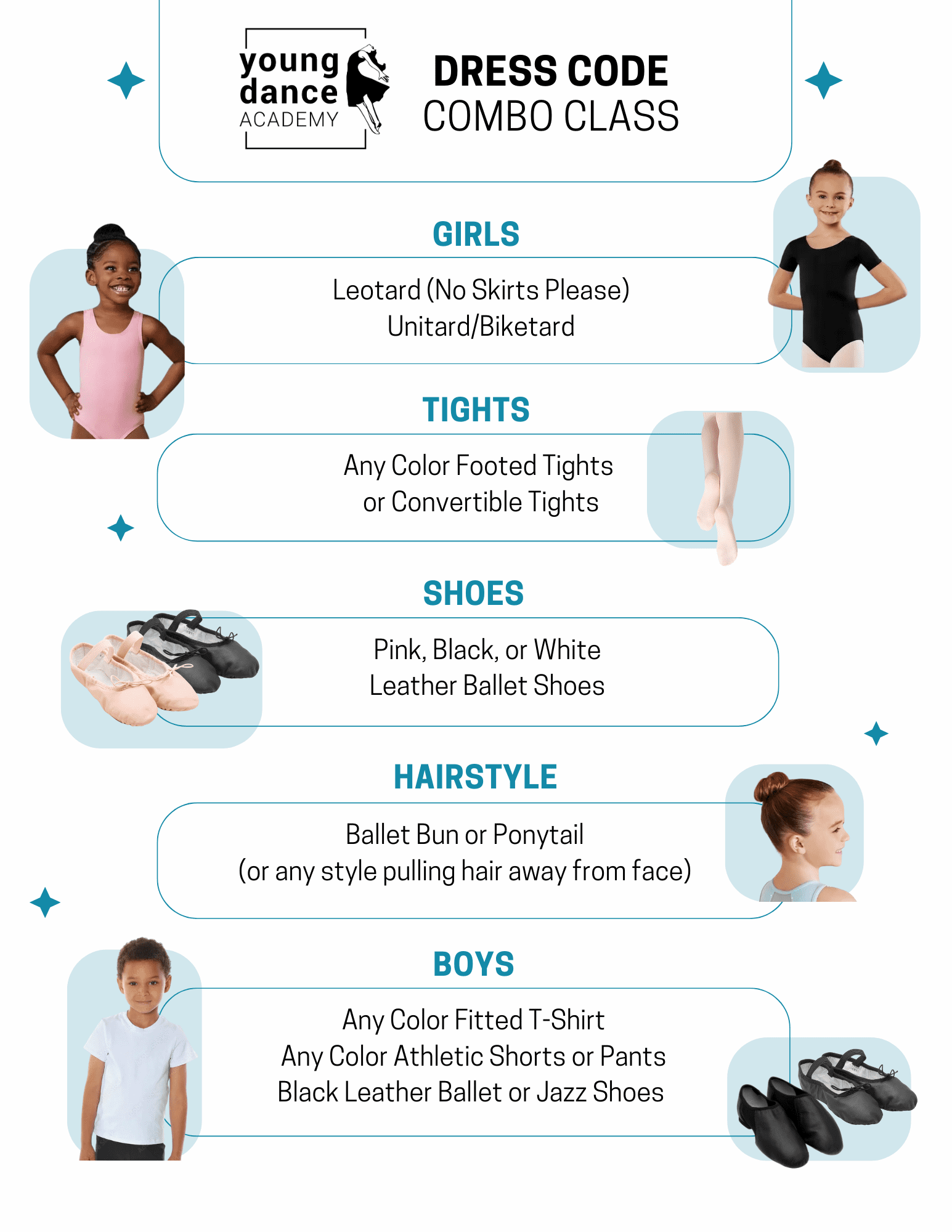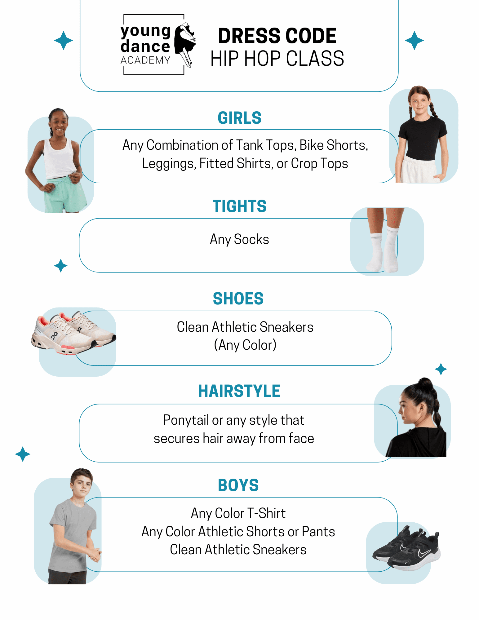 At Young Dance Academy, Inc., we emphasize the importance of proper attire and hair etiquette for all our classes. Adhering to our dress code not only fosters a sense of discipline but also enhances the learning experience for our dancers. We encourage students to come prepared and dressed appropriately, as this helps them feel confident and focused during their lessons. Our dress code is designed to support each dancer’s journey while ensuring safety and comfort. Join us in cultivating a professional atmosphere where every dancer can thrive and express themselves fully.